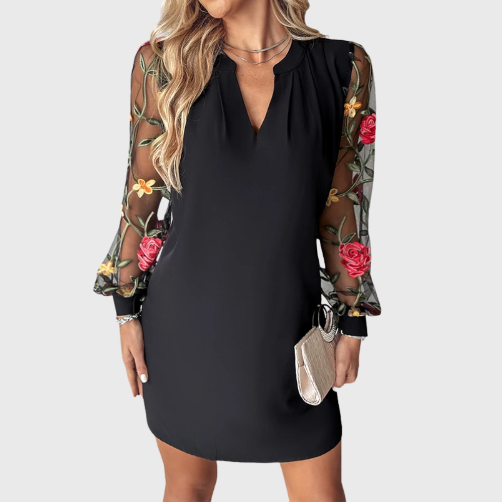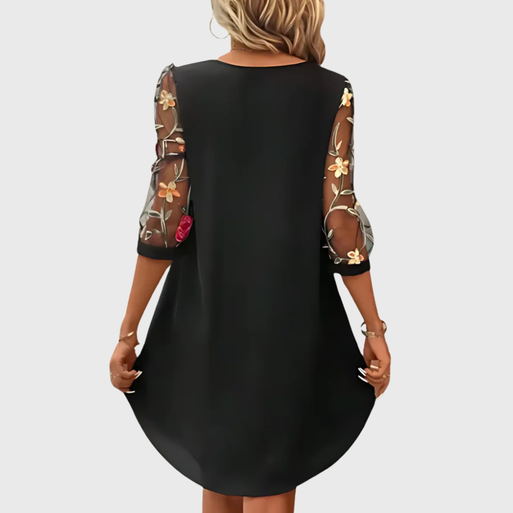 Dì addio ai materiali che fanno sudare. Realizzato con fibre naturali e leggere, questo abito ti accompagna con comfort anche nei momenti più intensi. Le maniche trasparenti, impreziosite da motivi floreali dipinti a mano, snelliscono la figura e aggiungono un tocco di raffinata femminilità. -
