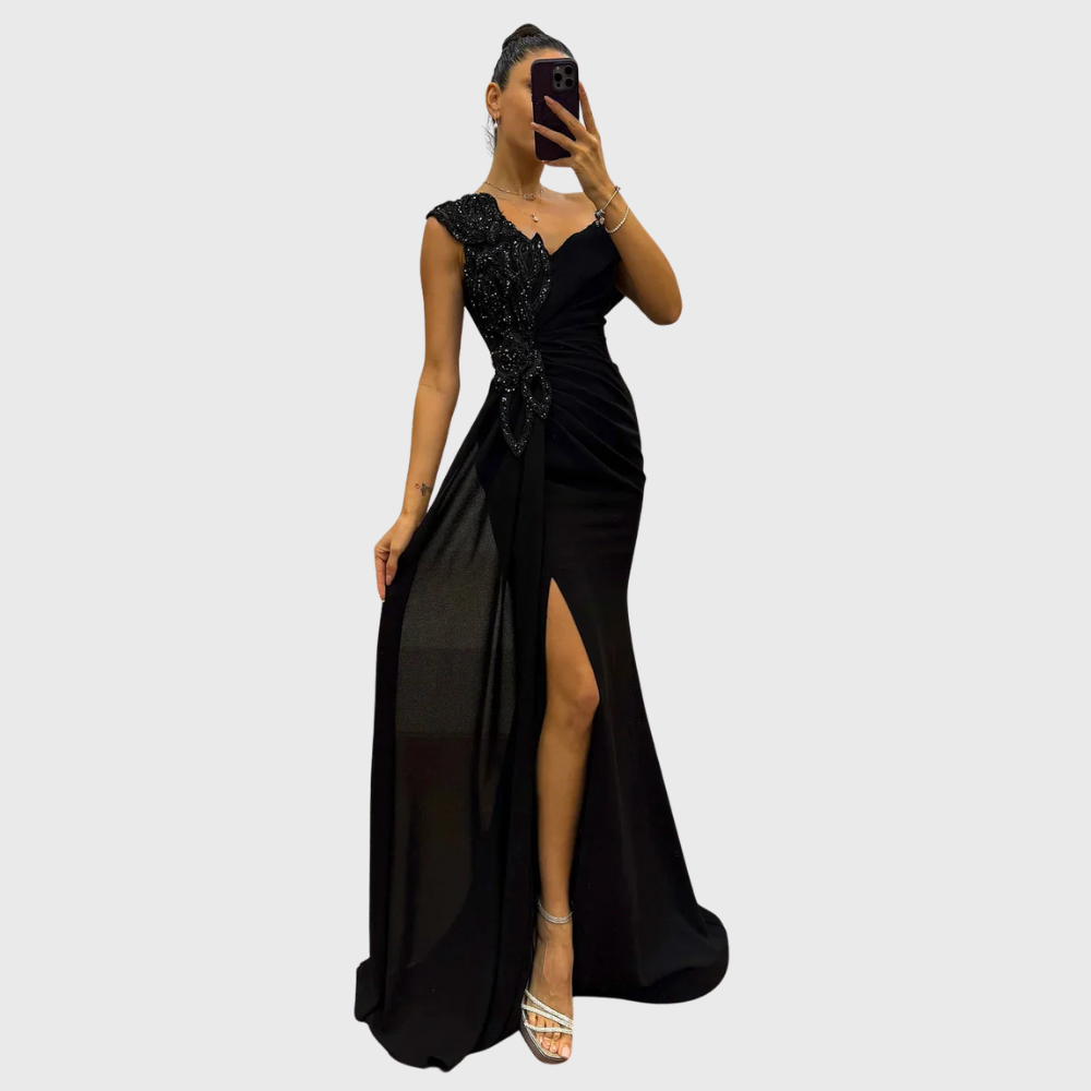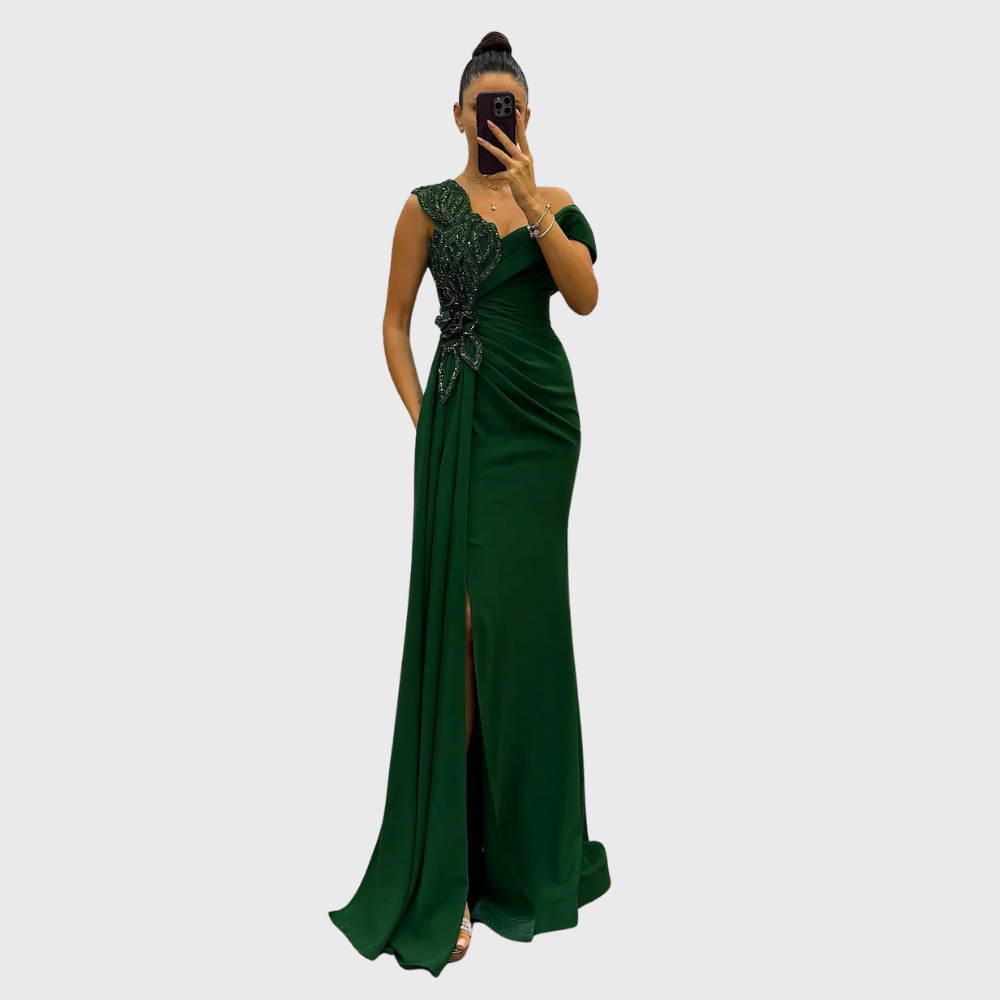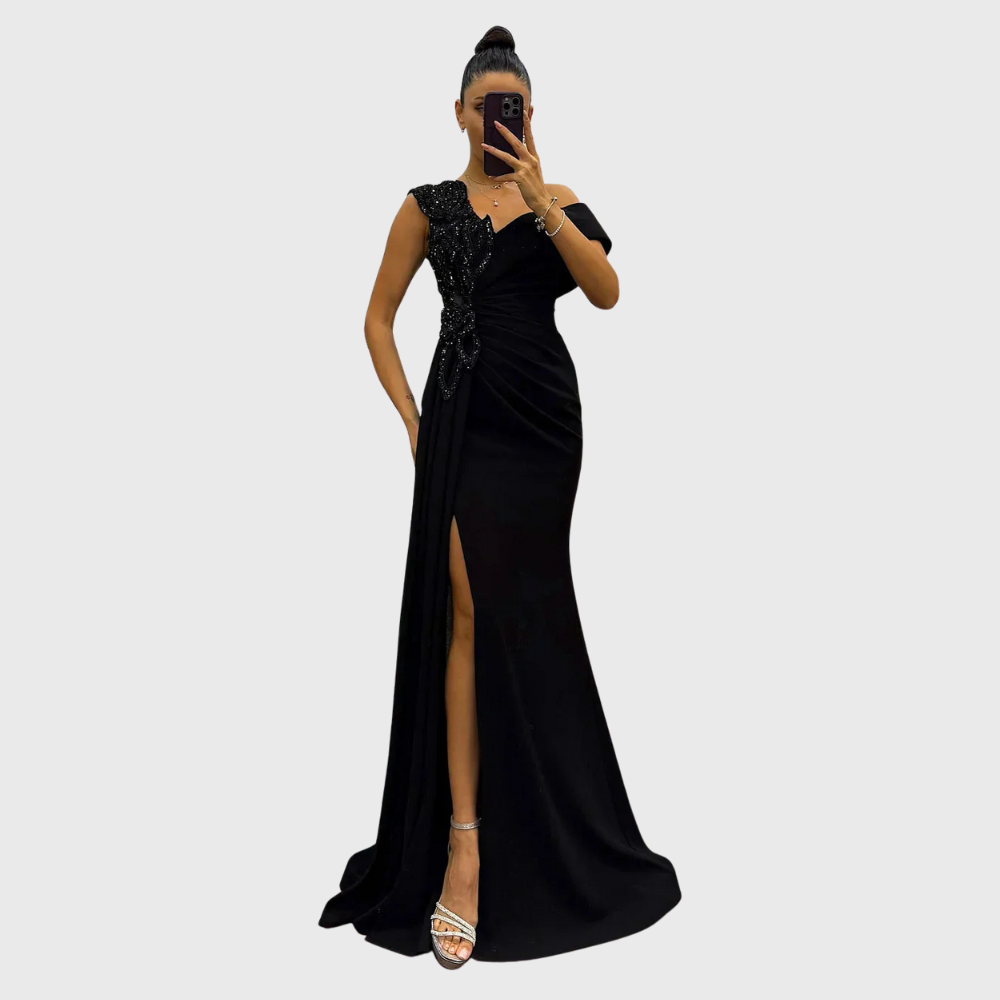 Abito da Sera Monospalla – Eleganza con Dettagli Ricamati