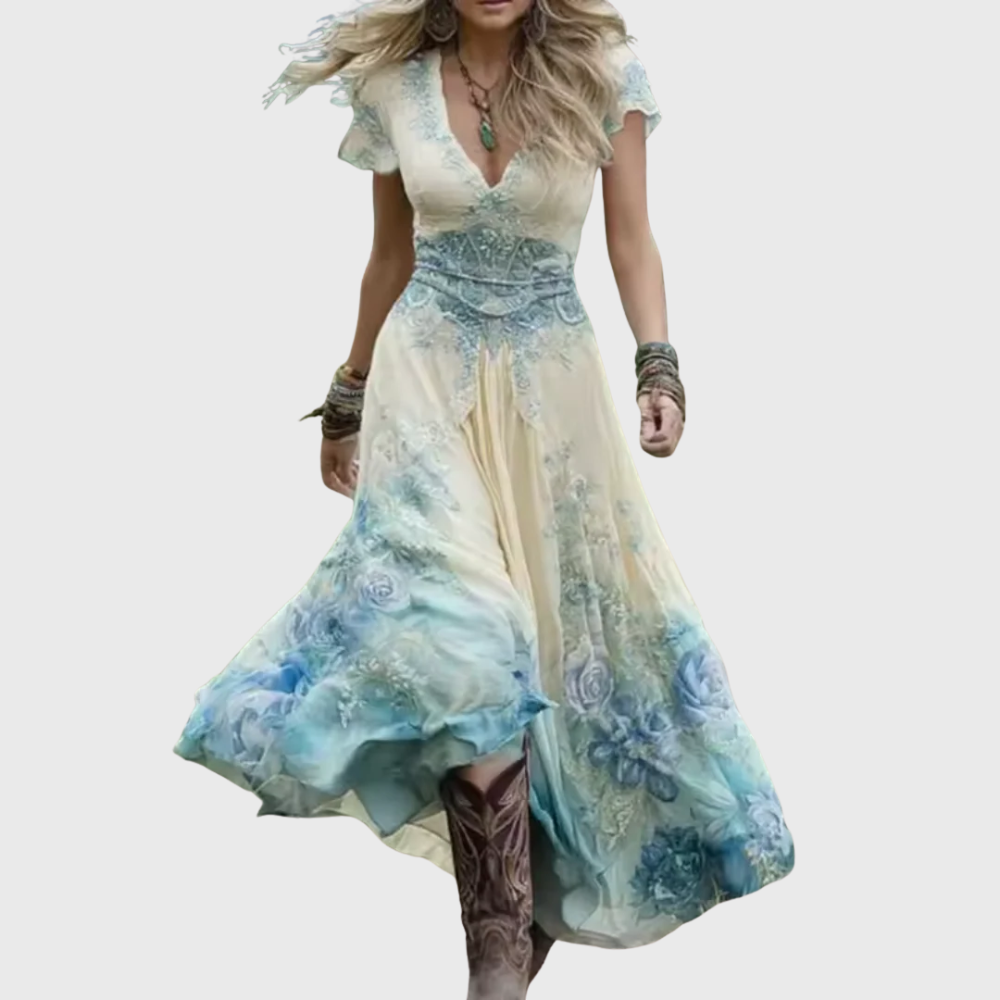 Questo modello cattura lo spirito dell’eleganza naturale e del fascino spensierato. Il tessuto fluido, i ricami intricati e il corpetto sagomato creano una silhouette che si muove con grazia e sicurezza. Perfetto per fughe in campagna, feste in giardino o passeggiate tra i fiori selvatici.