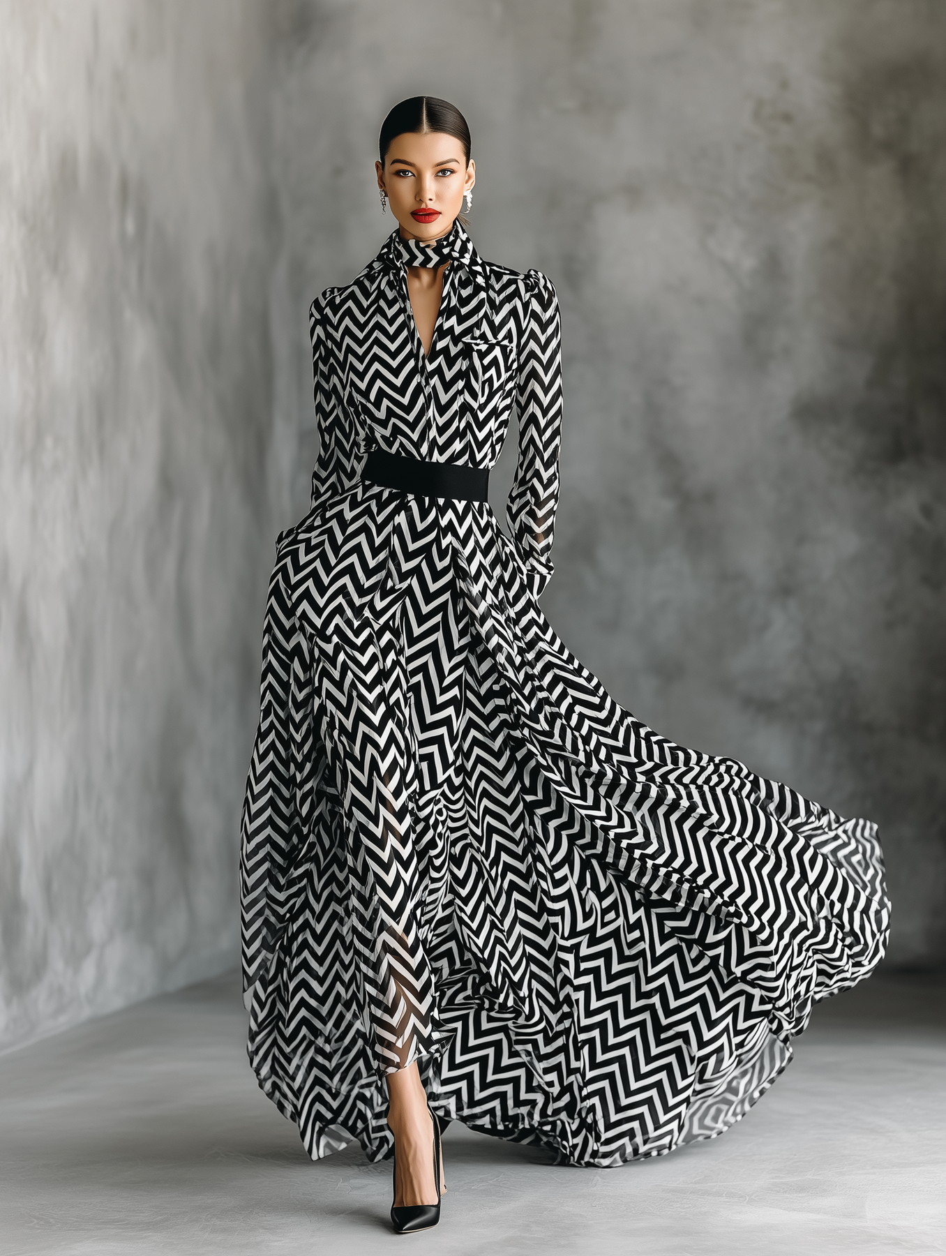 Abito Maxi Chiffon a Righe Bianco e Nero da Donna