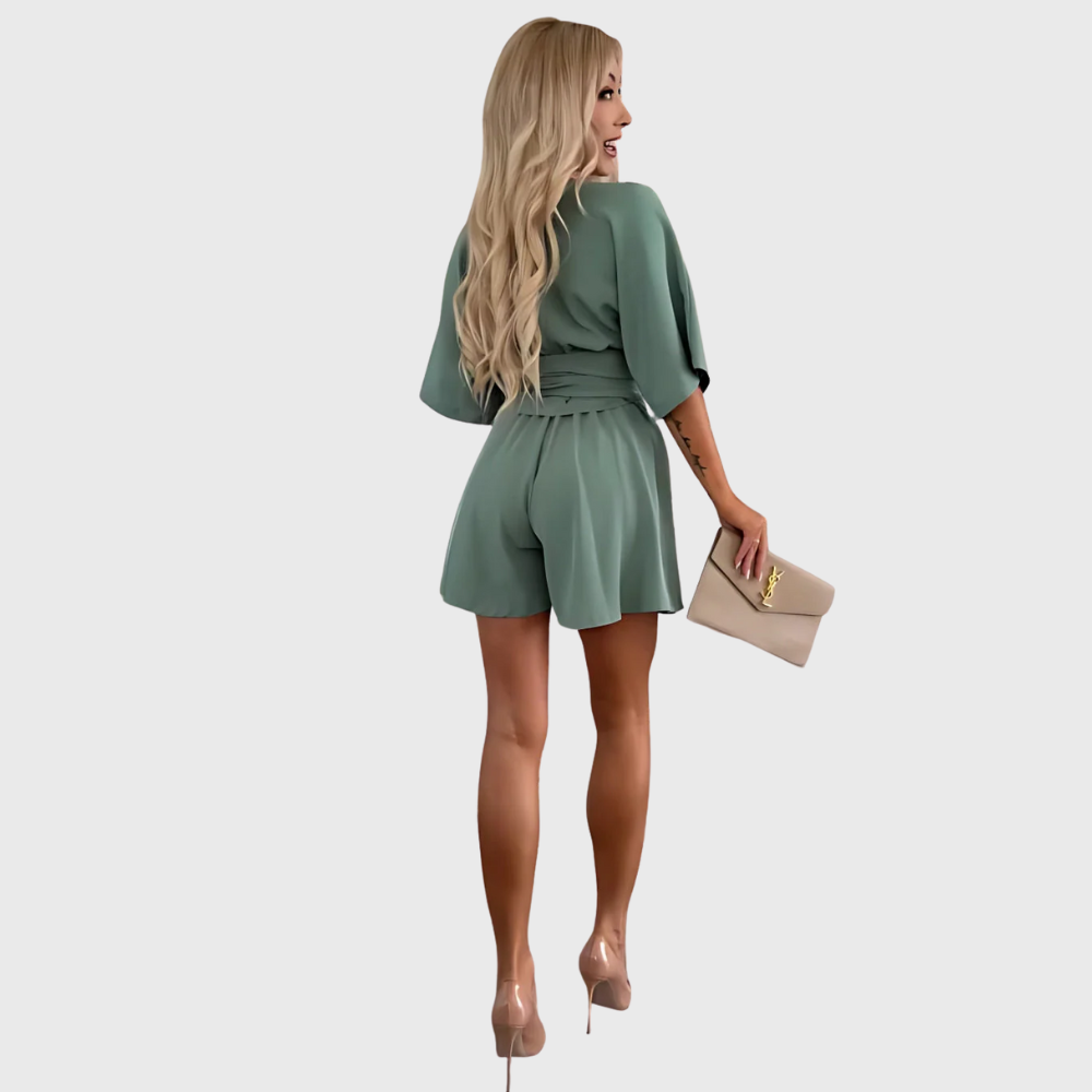 Questa elegante tuta aderente a portafoglio aggiunge freschezza e stile al tuo guardaroba. Il taglio morbido, la vita evidenziata e la cintura a fiocco creano una silhouette armoniosa, perfetta per feste estive, brunch tra amiche o un’uscita chic in città.